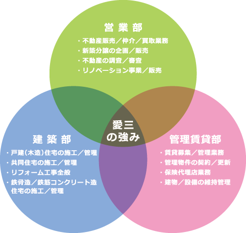 弊社では、建築・リフォーム・不動産・賃貸管理に至るまで、それぞれの専門分野を設け、専門家を配置しております。